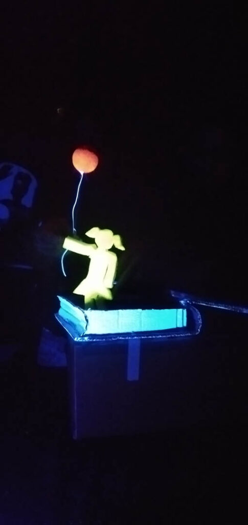 «Jugamos con nuestra imaginación y alegría. Investigamos nuevas formas de expresión, nuestras manos, una caja, un trozo de tela, una hoja papel, investigamos desde la sencillez y dejamos que nuestra fantasía y imaginación se exprese libremente sin límites. Damos formas a nuestros pensamientos y sentimientos que quedarán reflejados en una historia. En nuestra historia única